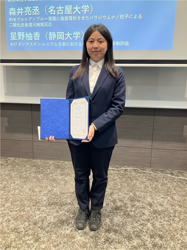 星野柚香さん(博士1年、環境・エネルギーシステム専攻)が12月16,17日に行われた第57回日本原子力学会中部支部研究発表会において奨励賞を受賞しました。